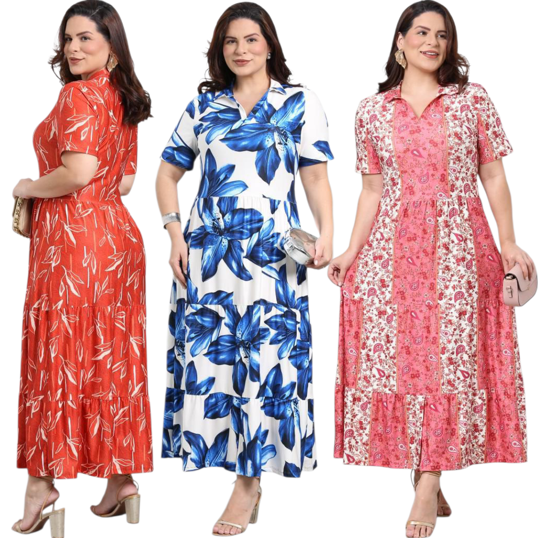 Vestido Longo Estampado com Gola Polo